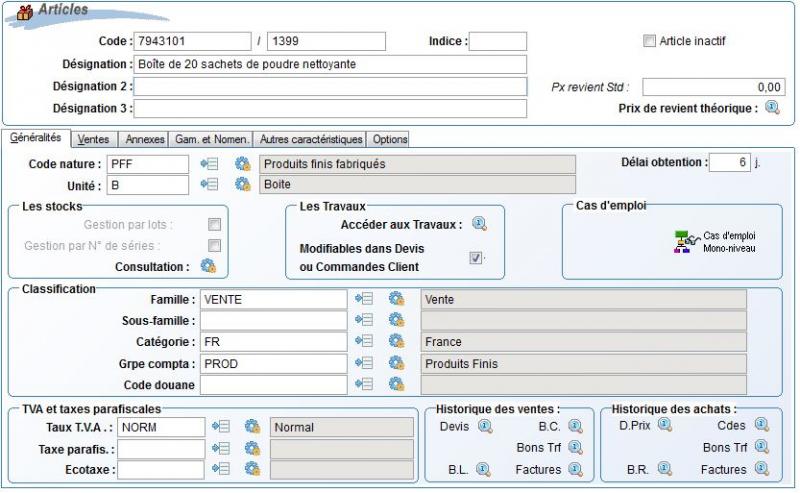 - Affichage des données selon la nature de l’article (Matière première, produit fini, semi-fini, emballage, prestation de sous-traitance, frais, …)