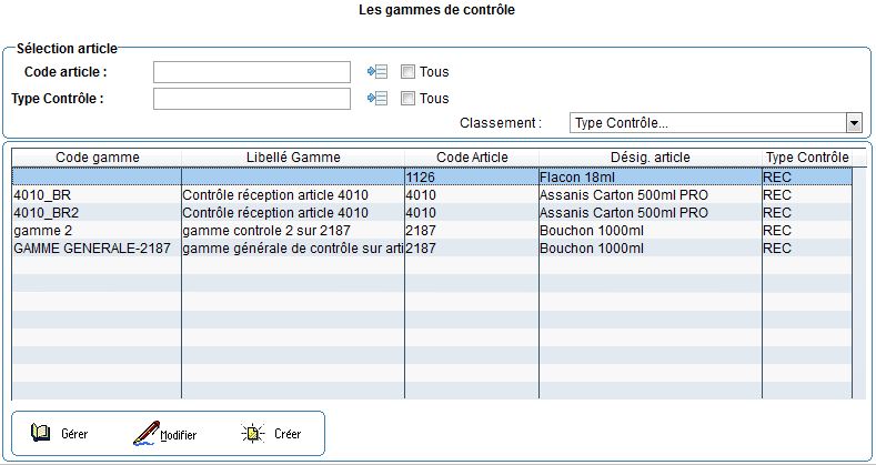 Création des Gammes de contrôle (contrôle en réception - contrôle en fin de production) avec saisie des valeurs de tolérance