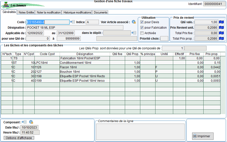 - Création des tâches et de leurs composants, leurs ressources et leurs outillages en une seule saisie.