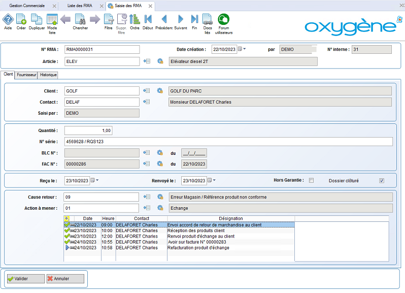 Solution métier, le composant S.A.V. RMA (Gestion de retour des Marchandises) Oxygène permet de gérer de A à Z les demandes de retour des produits de vos clients et l'ensemble du flux de la demande : motif du retour, sous garantie ou non, diagnostic, pièces et main-d'Œuvre, statut du RMA,...